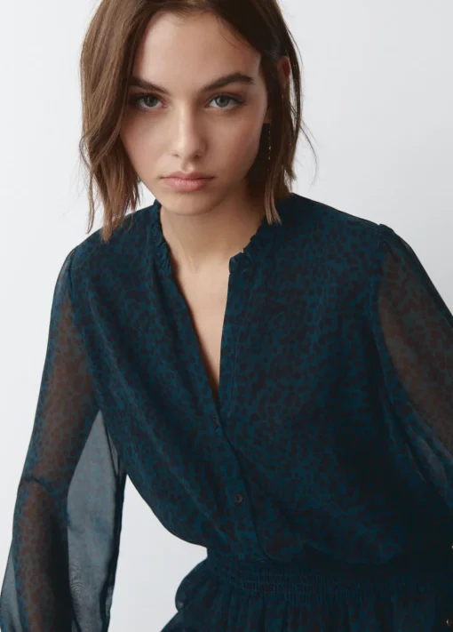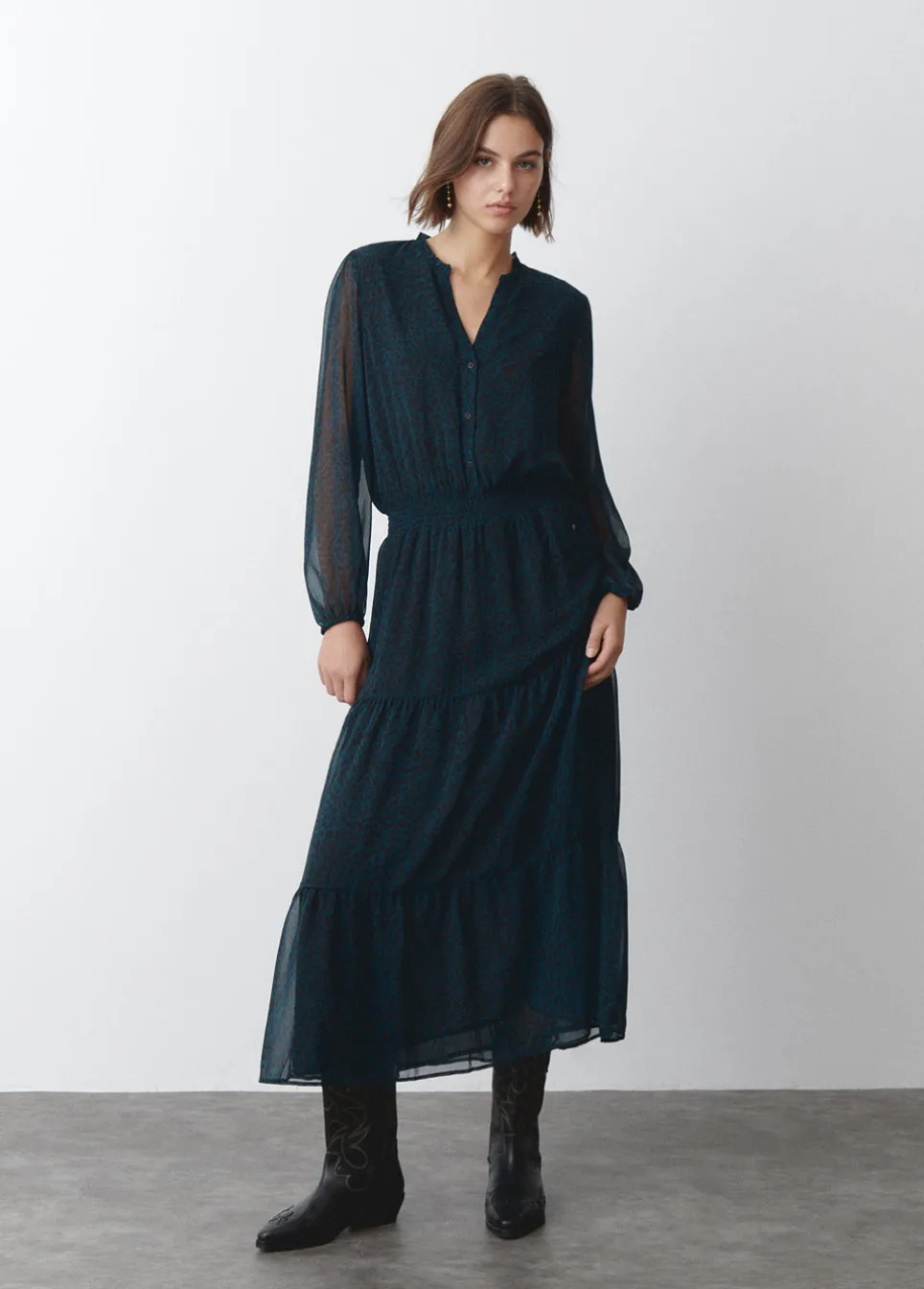 Vestido Largo Estampado De Manga Larga Abullonada, Cuello De Pico Con Botones Y Volantes.Composicion: